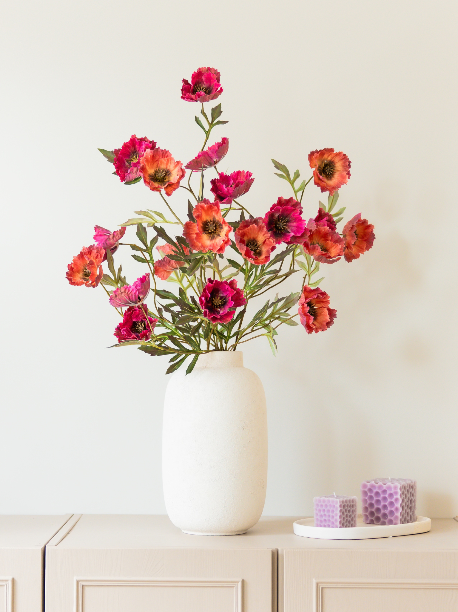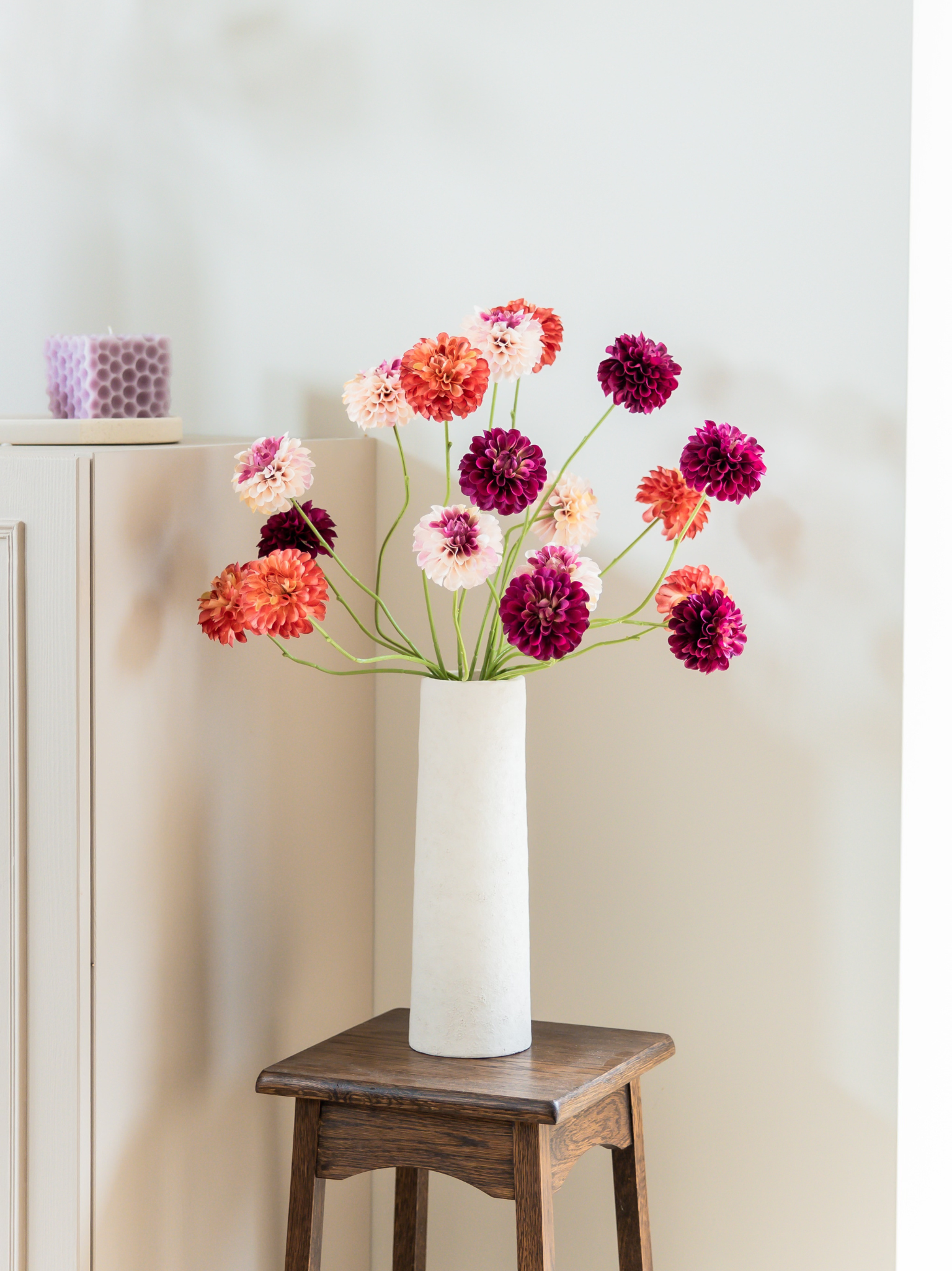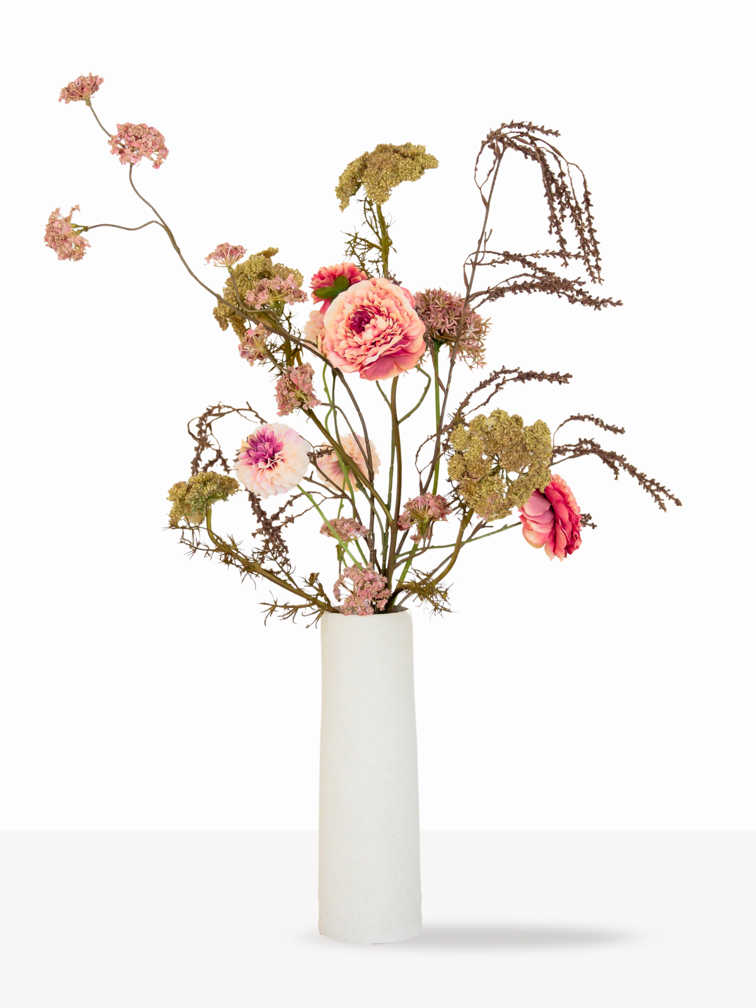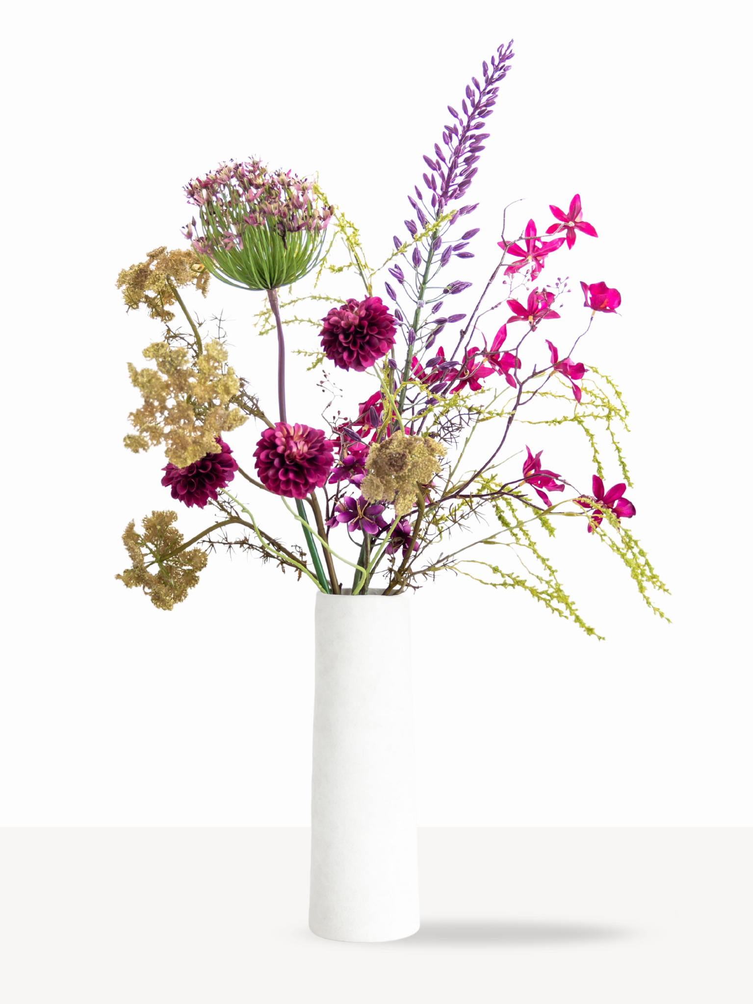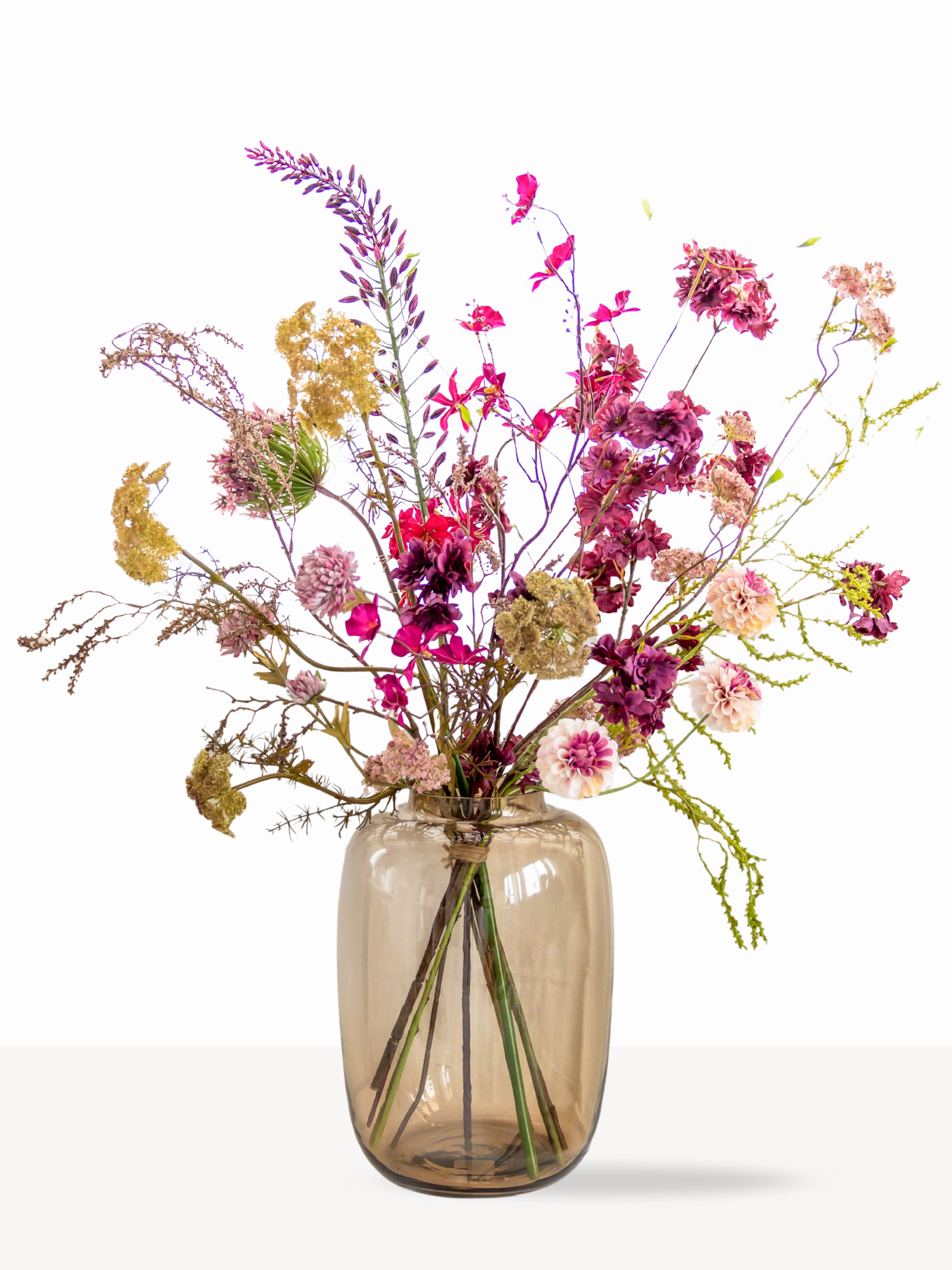 Gemaakt met liefde en precisie: deze handgeblazen vaas is ontworpen om jouw zijden boeket in het middelpunt te zetten. Een perfecte balans tussen rust en elegantie. Maak jouw zijden boeket af met de hand geblazen vaas Spring M.